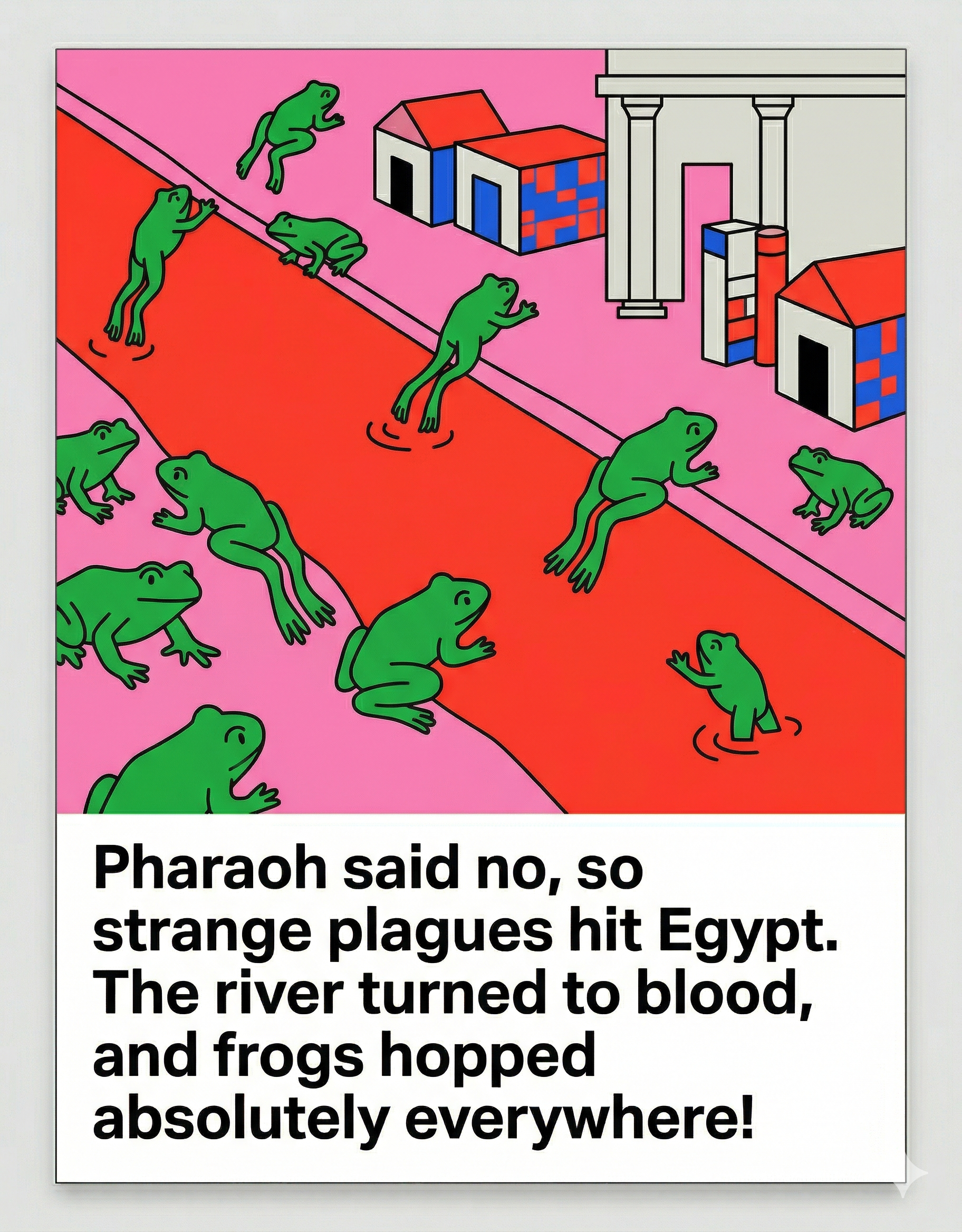 I used Gemini to create a complete illustrated version of the story of Exodus in a visual language I developed specifically for the table: bold primary colors, flat geometric cities, silhouetted animals, and big punchy captions written at a reading level that would let every kid at the table participate.
