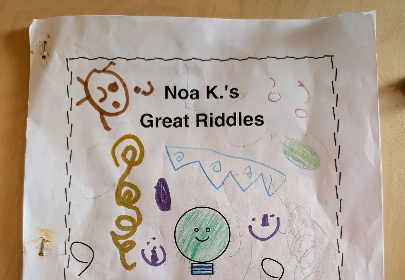 The only snag? Binding. Our stapler was broken. No problem: her dad, never one to be defeated by a household mishap, grabbed a 2x4 and a construction staple gun. He stapled the pages into the wood, pulled the booklet free, and flattened the staples with pliers. Suddenly, her homemade riddle book looked and felt like the real deal.